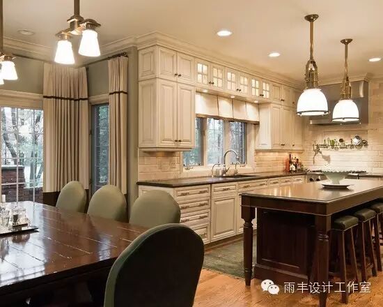 照明 光线适宜的灯安装在适当位置比采用高瓦数的灯更重要。工作台面区的采光应来自厨房顶灯和壁柜下前端安装的照明灯。重要的是灯光在工作台面上不反光,用壁柜下类似窗帘盒的遮盖物做适当遮挡,使眼睛不被灯光直射。视线 壁柜、抽油烟机或遮光盒都不应挡住使用者的视线,使他看不到台面后边的东西。工作台面和壁柜底端的距离保持50厘米的距离。拿取高度常用的炊具应放随手可及的地方。拿取高度 应设定在使用者手伸长后脚下不垫任何台阶所达到的高度。一些人,尤其是上了年纪的人,弯腰和下蹲会有困难。可拉出的层板或拉篮可以使他们容易取放东西。灵活性 每套橱柜都能在增配不同的配件之后满足用户的不同需求。就餐区设计良好的厨房要求橱柜和工作台面保持最合理的距离并使就餐区有足够大的活动空间,不影响开门。一条好规则可用于合适的餐桌:要有90厘米宽,餐桌两旁都要留有85厘米的自由空间来放椅子和过身。因此需要总宽度260厘米。最少也要求在240厘米,用80厘米宽的餐桌。餐椅拉出后与最近的橱柜的距离为60厘米,而与炉灶的距离为75厘米。从餐桌的一端到最近的橱柜应有90厘米,而距离炉灶100至120厘米。玻璃门橱柜玻璃门应布置在就餐区,因为在这里玻璃不会被烹煮和洗涤弄脏。
