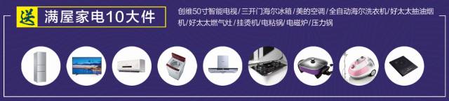 创维50寸智能电视/海尔三门冰箱/美的空调/海尔全自动洗衣机/好太太抽油烟机/好太太燃气灶/电磁炉/压力锅/电粘锅/挂烫机
