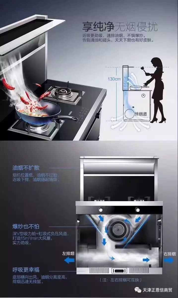 海尔集成灶下排风设计取消了置于人体头部的噪声源,应用了超低、噪声技术和静音风道设计技术,低噪音。