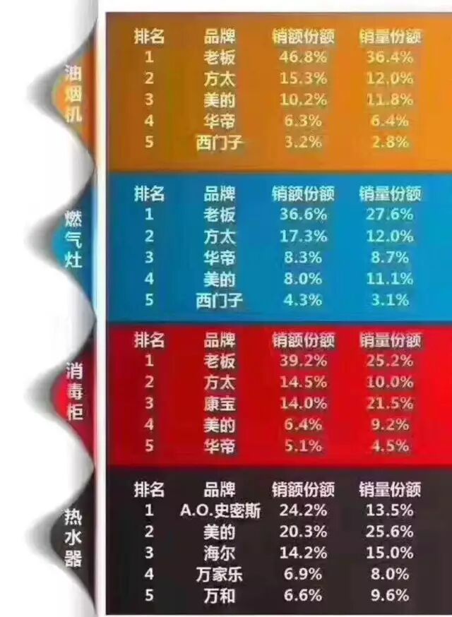 而且,根据国内最新快报,老板电器在油烟机、燃气灶、消毒柜产品占据市场份额榜首,所占百分比远高于第二名,可见“老板电器”早已成为国内家庭的第一选择!