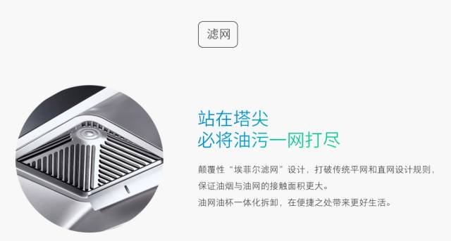 汲取世界著名全钢铁建筑埃菲尔铁塔的设计灵感,颠覆传统平网和直网设计,顺应油烟升腾方向,以极致创新,重新定义油烟机!
