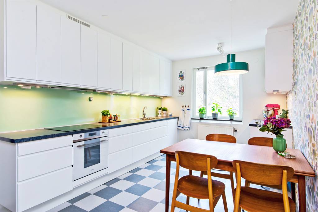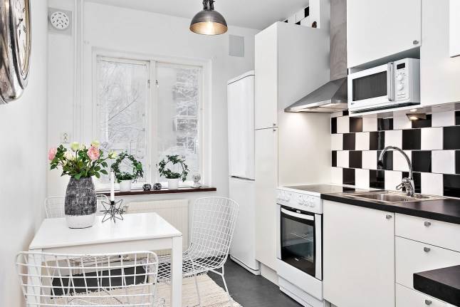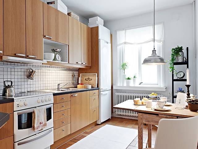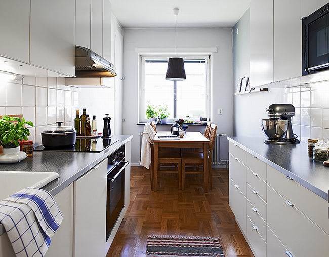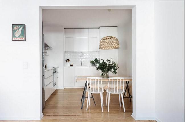 不同的房型,厨房的造型也是不一样的,大致可以分为狭长形厨房和方正形厨房。对于不同的厨房形状,我们的餐桌安放方式也是多样的。