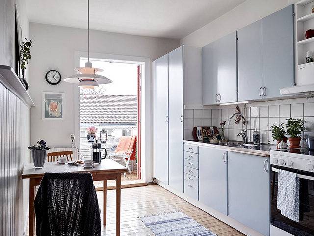 如果你家的厨房空间够长,除了安置橱柜,你还可以分出一半的空间来放置餐桌。此时,橱柜的长度就必然会受限,收纳的空间也会受限,所以壁柜就是必备的物品。餐桌安置在靠窗的一边,这样油烟味会好很多。