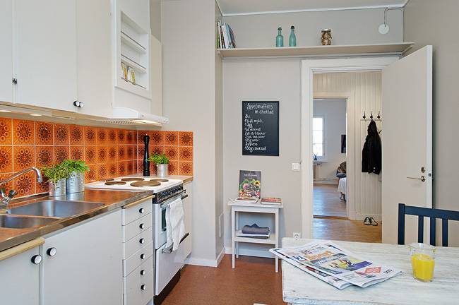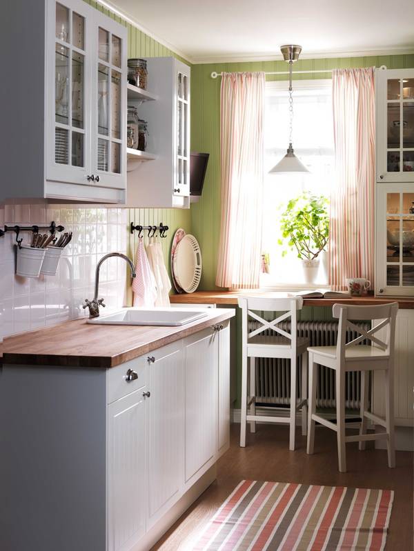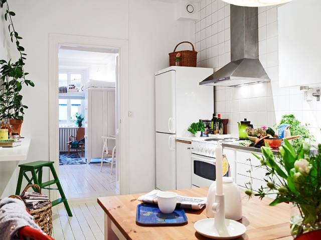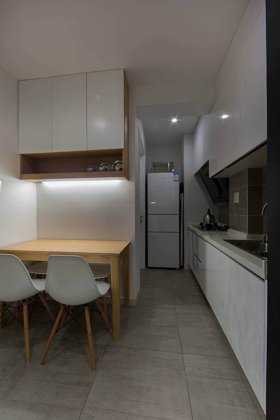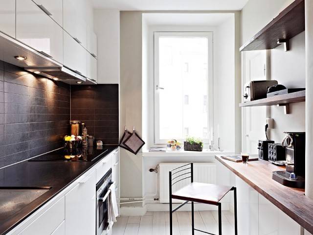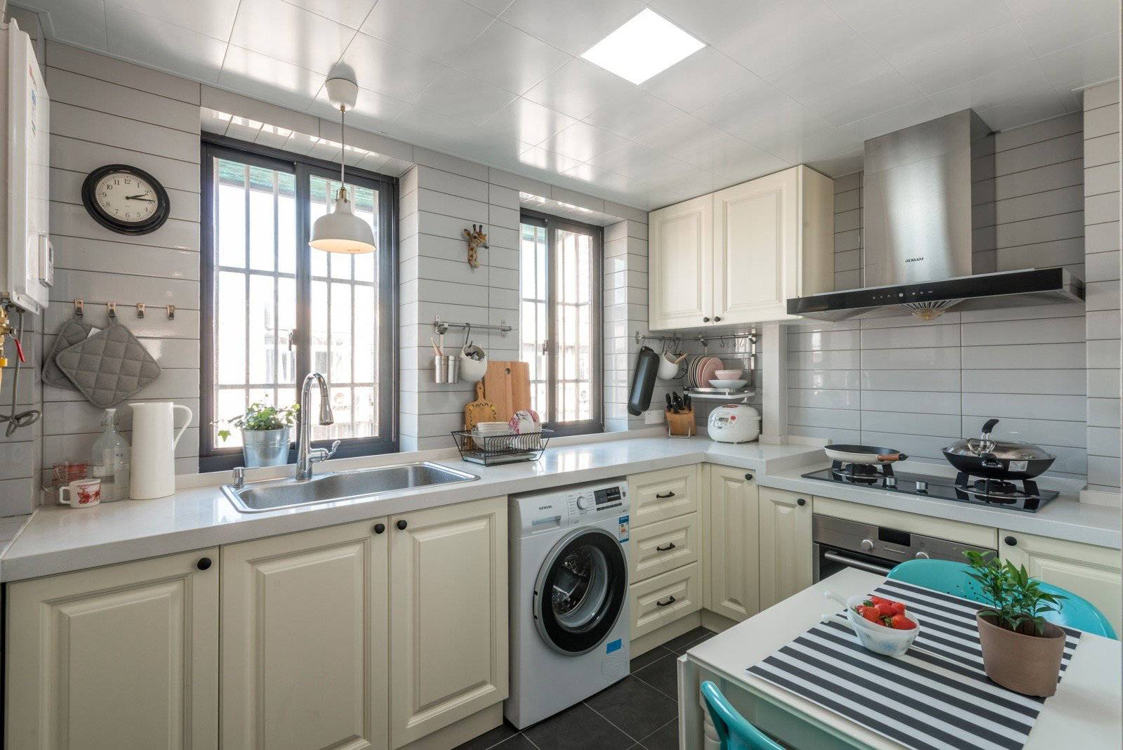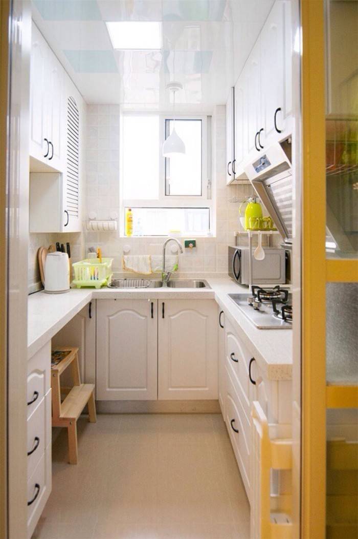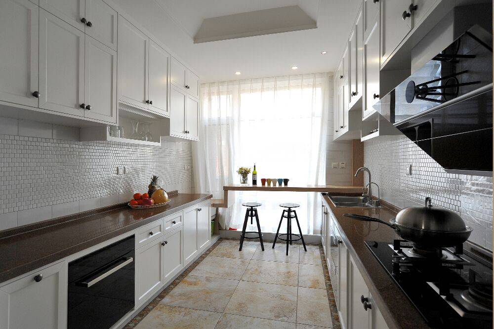 狭长形厨房的橱柜一般会被定制成L型、一字型或二字型,这时我们要巧用橱柜以及空余的区域。对于L型和一字型的橱柜设计,我们可以利用其另外一个长边来摆放餐桌。由于厨房空间有限,那种大餐桌大家还是不要考虑了,长形或方形的小餐桌就可以了。或者直接在空闲的那面墙上订制长形的搁板作为餐桌,再摆一两张椅子就可以啦!