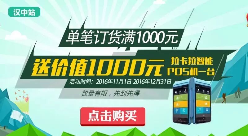 在新商盟汉中站订货满1000元,送价值1000元拉卡拉智能POS机一台,数量有限,先到先得。拉卡拉智能POS机,到账安全,费率标准,装机高效……信用卡0.6%,借记卡0.5%,20元封顶。扫码支付0.38%(支付宝,微信支付)。详询:18609266622