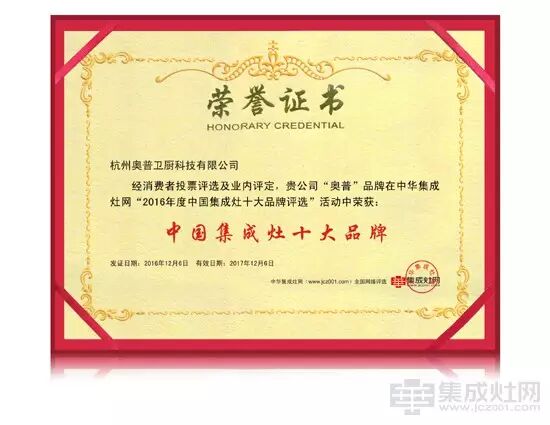2016年12月6日,由中华集成灶网主办的2016年度“第七届中国集成灶十大品牌”网络评选榜单荣耀揭晓。作为中国集成灶行业的领先品牌,奥普集成灶凭借强大的综合实力,荣获“中国集成灶十大品牌”称号。奥普获此殊荣,我们向厂家表示祝贺!