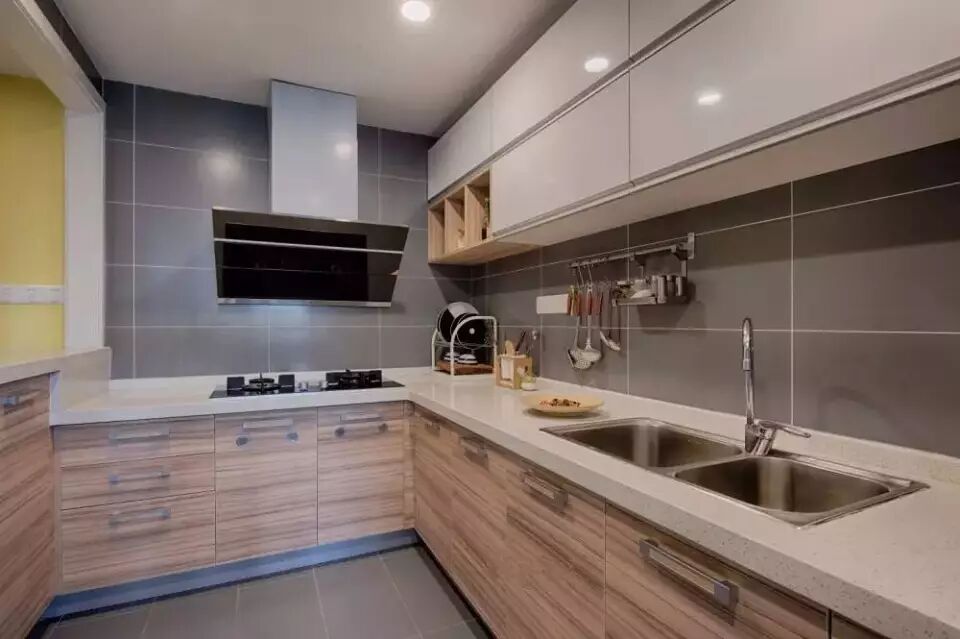 ▼两侧做橱柜,中间嵌入侧吸油烟机,这种做法相对比较实用派;