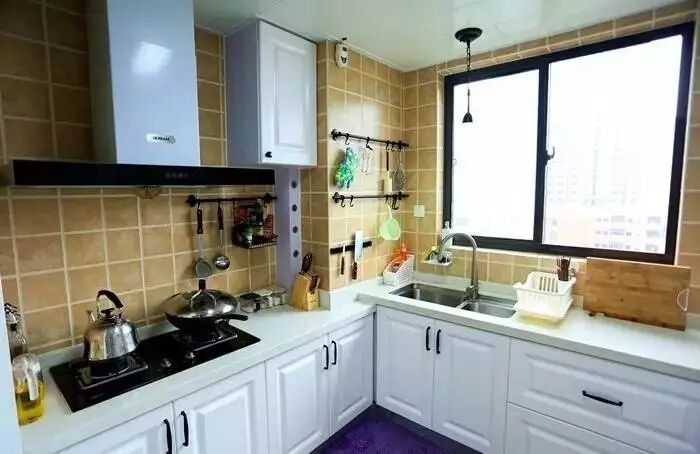 ▼白色的橱柜主体与油烟机的色调接近,顶吸油烟机容易碰头,各位个子高的慎重;