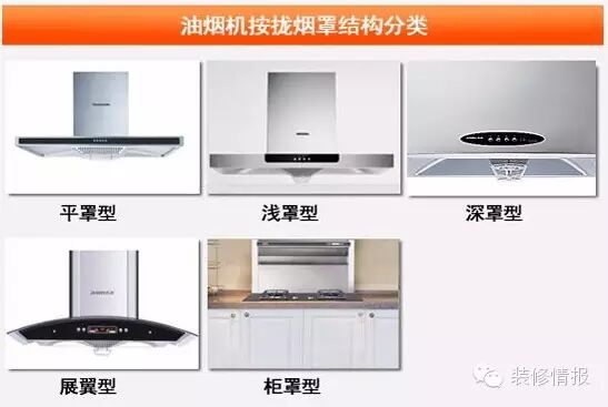 同一位置的抽油烟机因为拢烟罩琪吸收效果也不同,下厨频率高的建议选吸力强的抽油烟机,不常下厨的则可以相对降低抽油烟机的性能要求。主要可以选择平罩型、浅罩型、深罩型、展翼型、柜罩型、阶梯式六种不同类型。