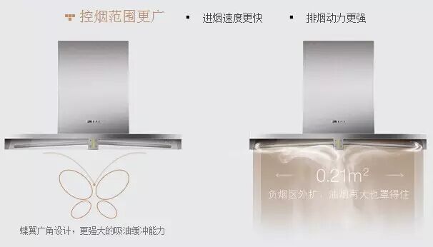 相比之下,方太云魔方最具特色的是颠覆传统欧式机设计理念的“蝶翼环吸板”,在功能扩展的同时,也让云魔方整机给人的感觉就如一只翩然而舞的蝴蝶,为厨房增添了一道亮丽的风景线。