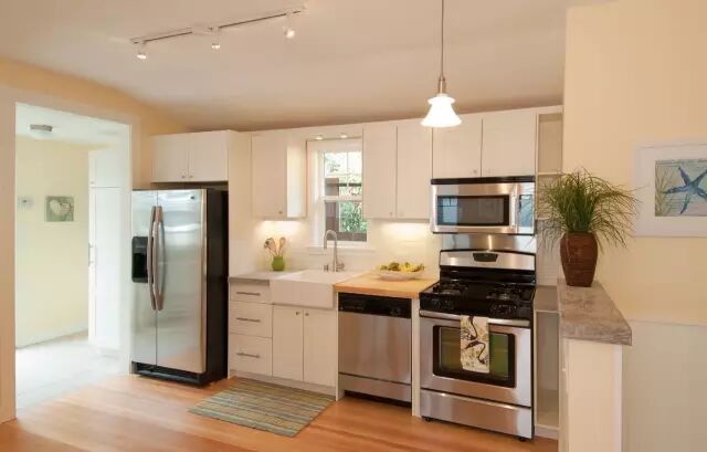如果三台电器都有的话,可以根据空间大小按照一字型、T字型或者I字型排列,最常使用的电器(通常是微波炉)要放在最顺手的位置。