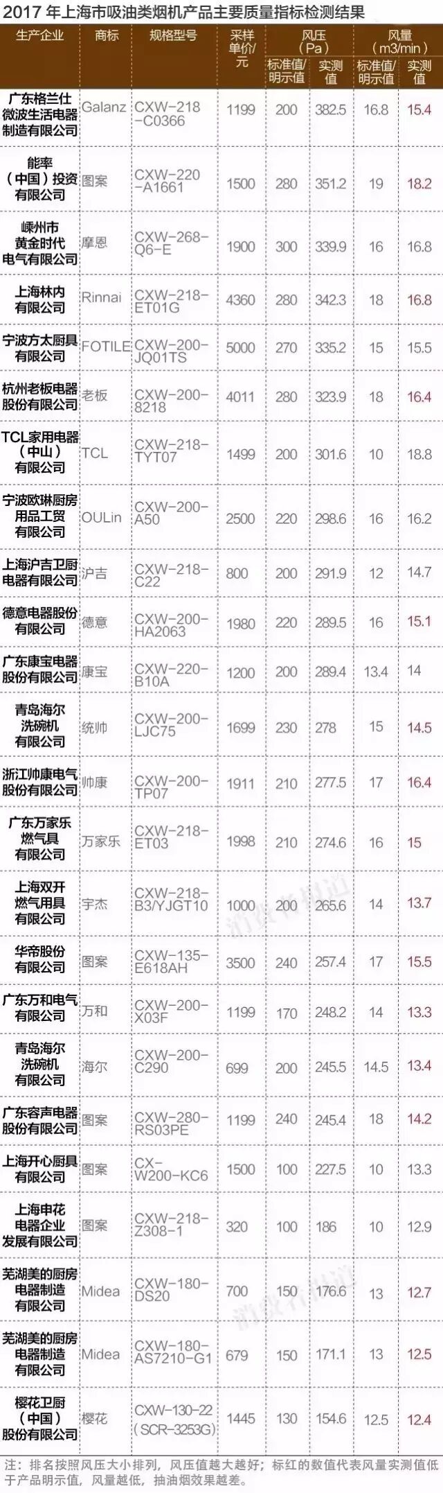 另外,此次抽查的24款产品的风压(吸油烟机抗倒风能力的指标)、常态气味降低度(除异味能力的指标)和噪音的实测值均满足标准值/明示值要求。