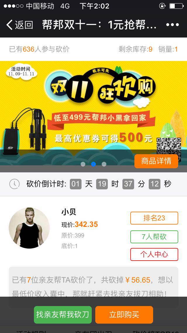 价格:原价399元/只。可请好友帮忙砍价,砍价好友越多,获得优惠越多。最多可砍至1元/只。