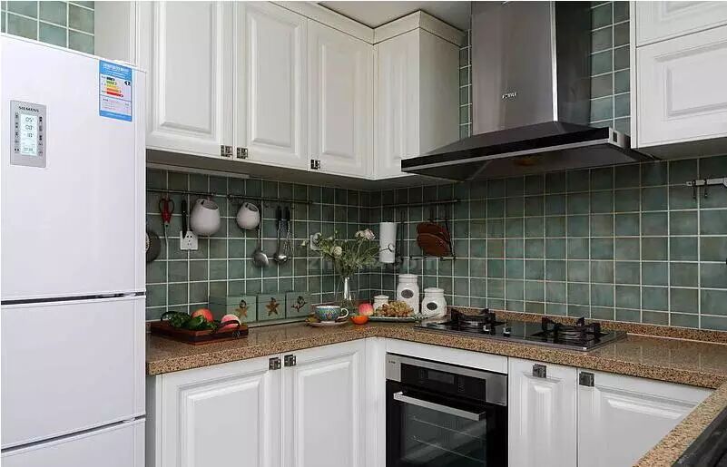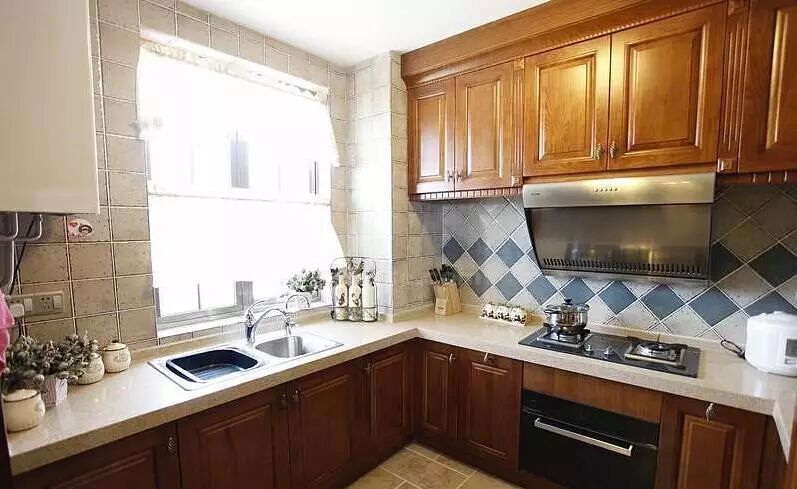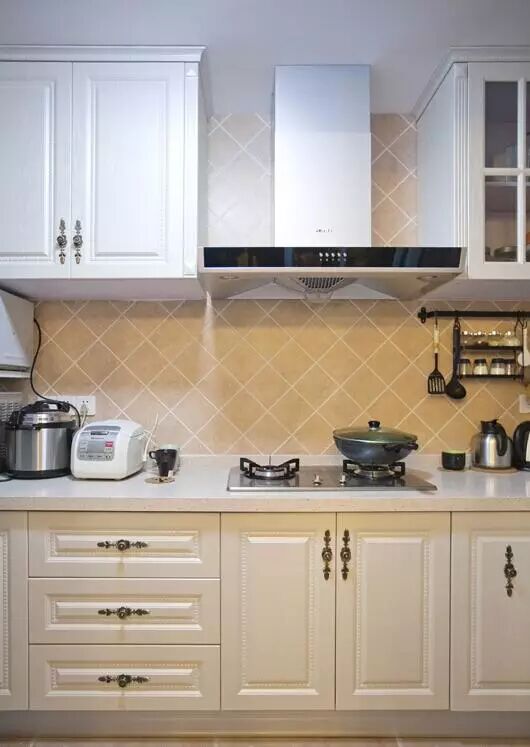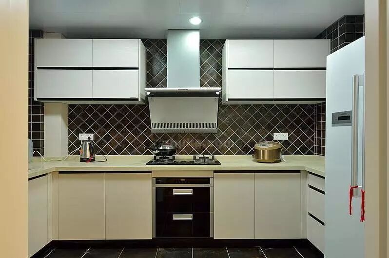 上图的业主选的是顶吸式油烟机,也同样在油烟机的上面做了橱柜,大家可以参考一下安装后的效果。