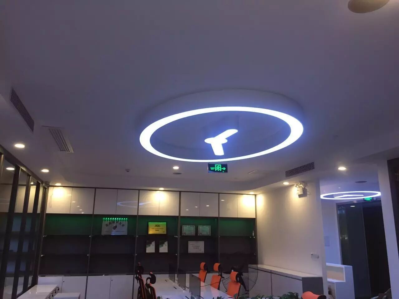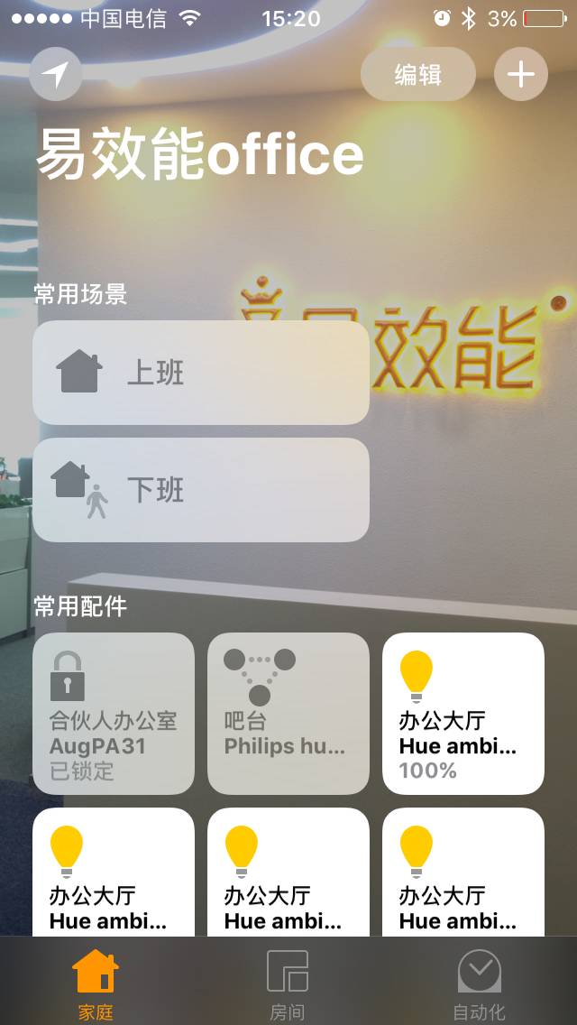 进入公司大厅,冲Siri说“打开办公大厅灯”,于是顶上的“时钟”灯光开启。