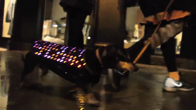Disco Dog是由3.7V聚合物锂电池驱动,表面共有256个LED灯,主人通过配套手机APP点亮LED,狗狗立马就能成为万众瞩目的焦点。如果狗狗不慎走丢,脱离了手机蓝牙的范围,它就会立即出现“LOST(走失)”的样式。让遇到狗狗的人知道它需要帮助。
